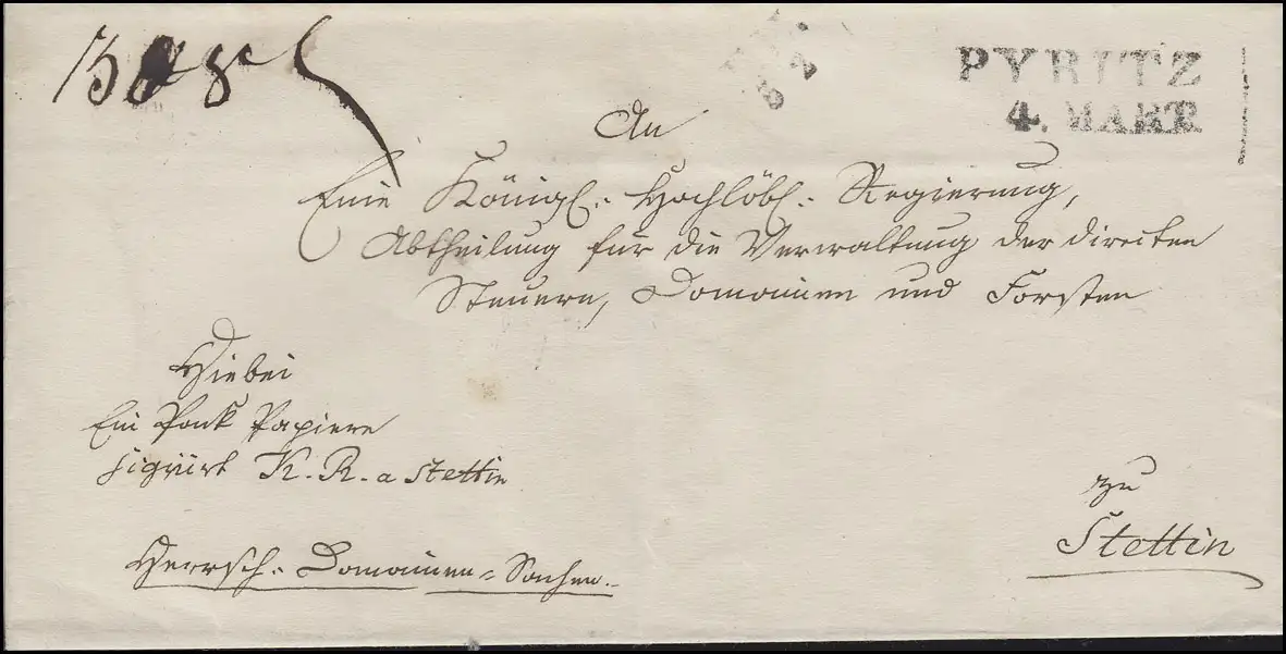 Preußen Vorphilatelie Briefhülle Zweizeiler L2 PYRITZ 4. MÄRT nach Stettin