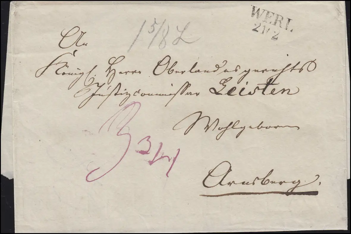Preußen Vorphilatelie Briefhülle Zweizeiler WERL 12.2. und Ausgabestempel 22.2.