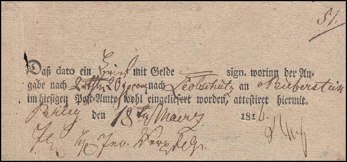 Preußen Vorphilatelie Einlieferungsschein über Geldbegleitbrief Brieg 18.3.1816