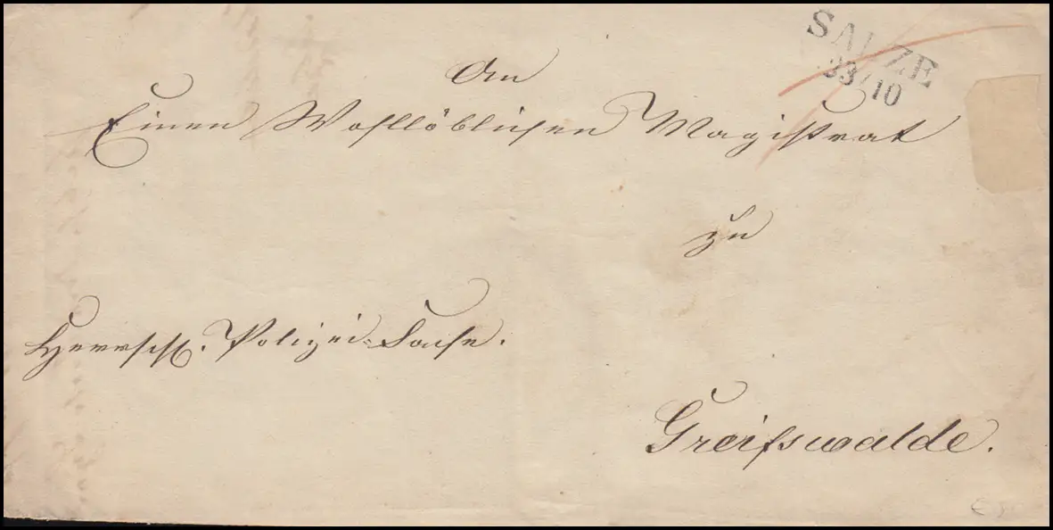 rückseitg Dienststempel "... ANSTALT ZU GR. SALZE" .. an die Pommerische Polizeibehörde in Greiswald
