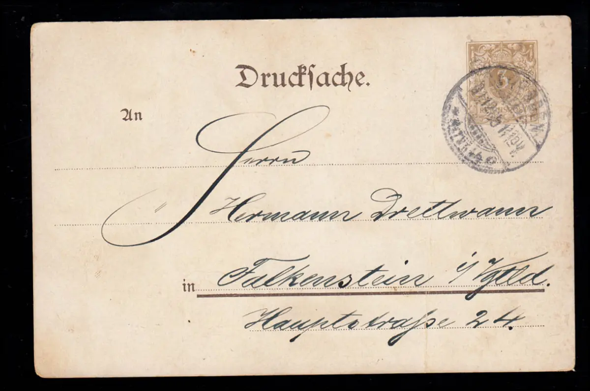 seltene Privatpostkarte als Drucksache mit 3 Pfennig braun nach Falkenstein / Vogtland, geknickt