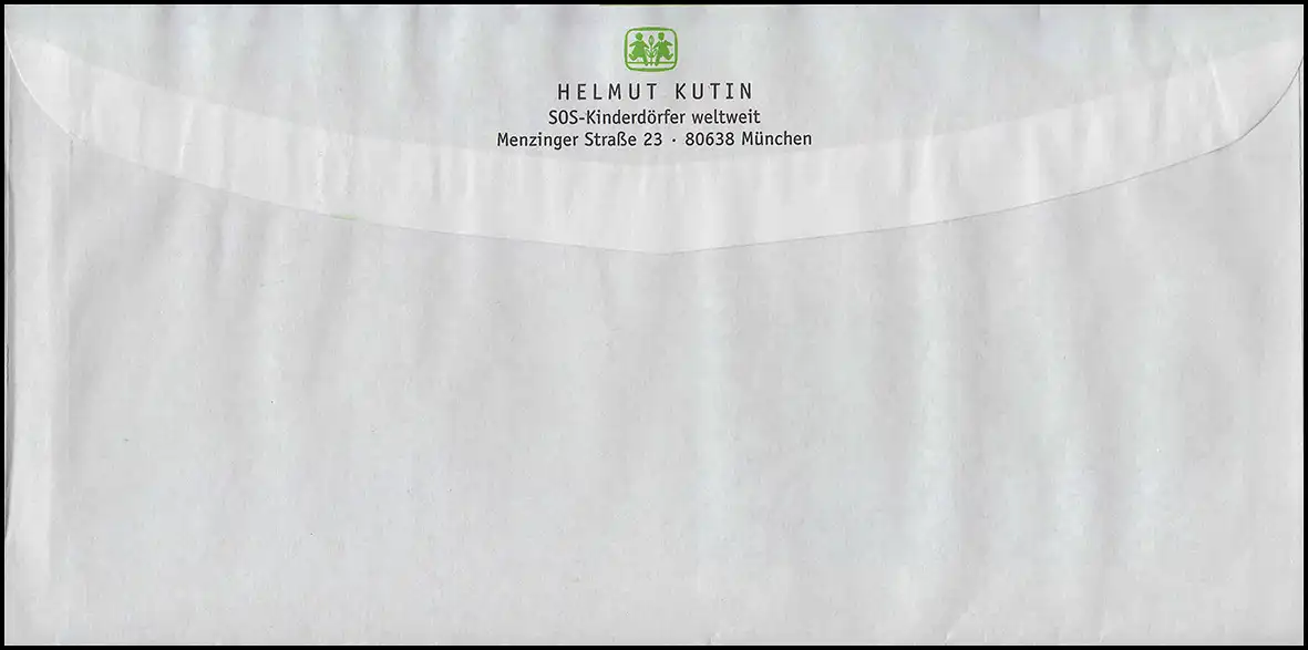 Absender: Helmut Kutin SOS-Kinderdorfer weltweit in München, ohne Auftragskennung auf weißem Papier (siehe Anmerkung im MICHEL Ganzsachsen-Katalog nach U 21)