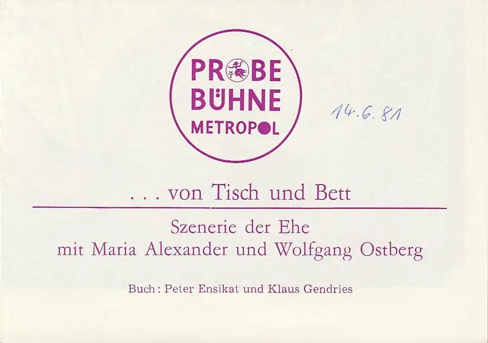 Probe Bühne Metropol: Programmheft Peter Ensikat / Klaus Gendries VON TISCH UND BETT Szenerie der Ehe Premiere 31. Januar 1981.