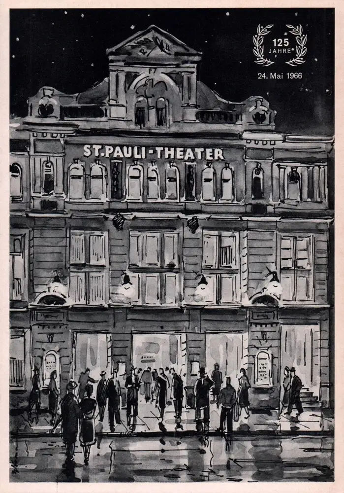 Programm zu "Das Nachtjackenviertel". Hamburger Volksstück in 3 Akten nach einer Idee von Theodor Franke von Kurt Simon. Musik von Wilhlem Wilke. Unter der Regie von Kurt Simon spielten Otto Benecke, Grude Possehl, Bobby Burg, Christa Siems, Gerhard Olschewski u.a.m. Mit einem Beitrag über das 125jährige Jubiläum des Hamburger Volkstheater (24. Mai 1966) und die Jubiläen von Kurt Simon und Christa Siems. - Gut u. sauber