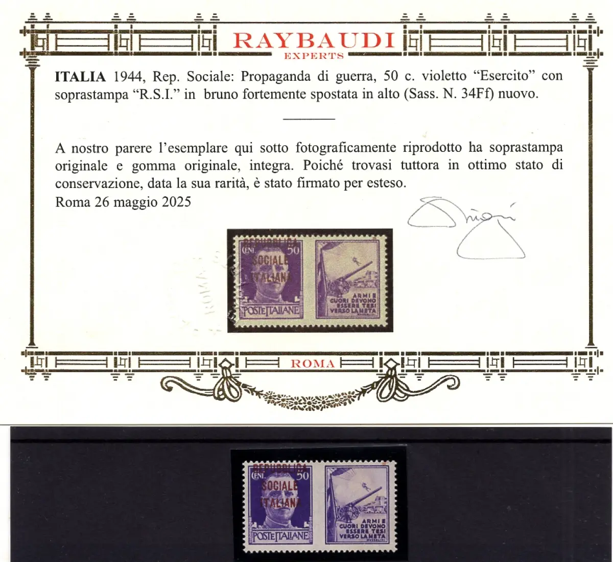MNH - Vollgummi - Kriegspropaganda Cent. 50 n. 34Ff Aufdruck in Braun stark nach oben verschoben, neuer perfekter Vollgummi - Sehr Selten - Cert. Raybaudi - Kat. euro 5000 Cod. 3240/WEB