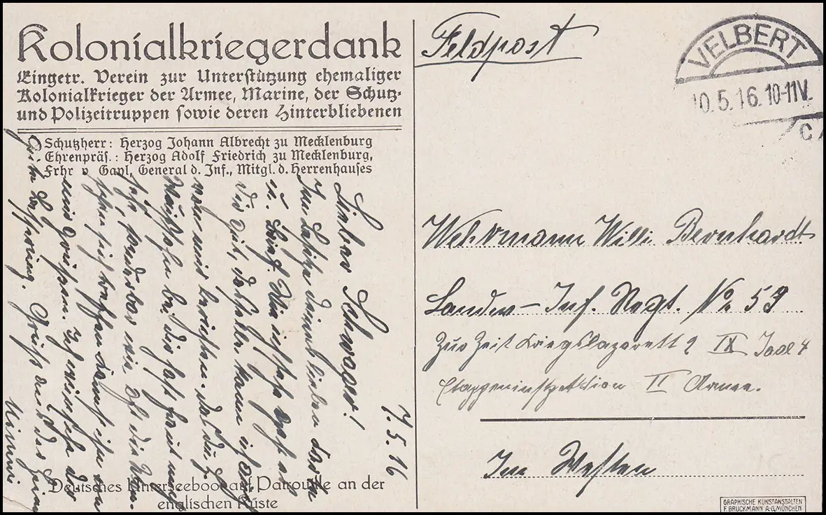 Feldpost von VELBERT 10.5.16 an das Landes-Inf.-Regiment 59