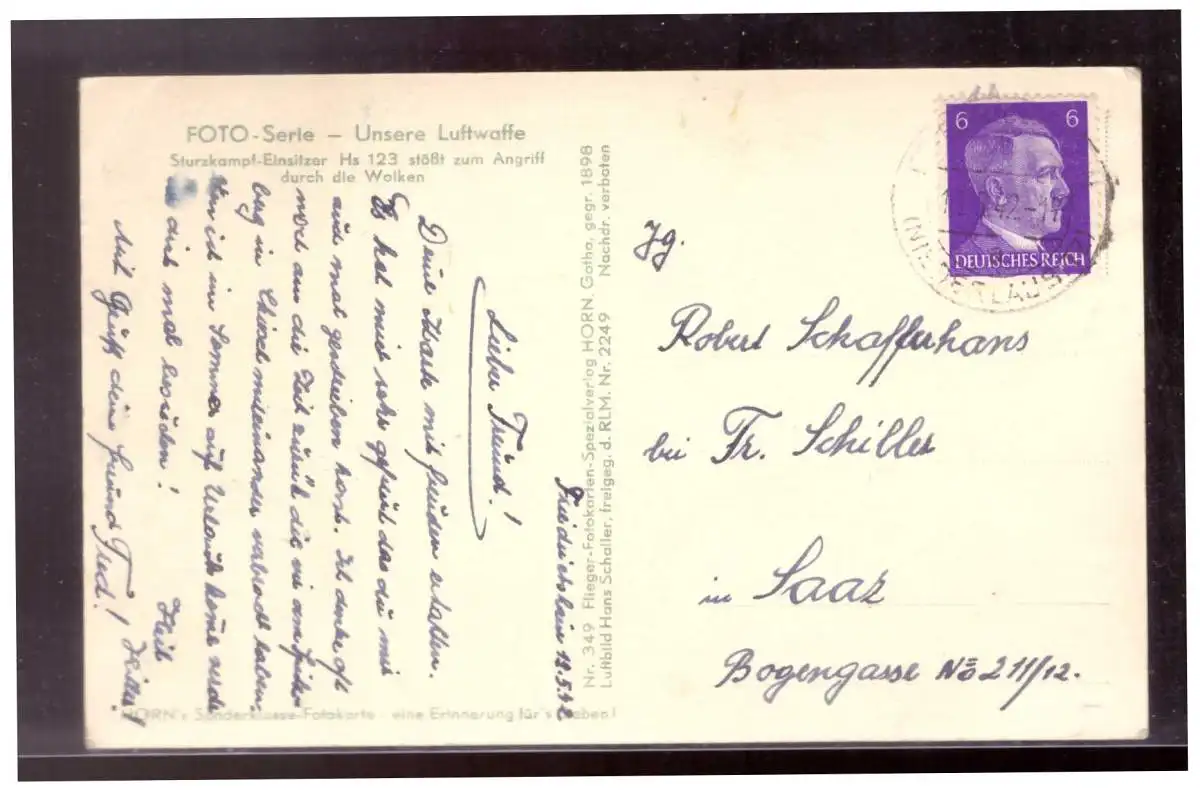 Titel: Dt- Reich (021842) Propagandakarte, Unsere Luftwaffe, Sturzkampf-Einsitzer Hs123 stößt zum Angriff durch die Wolken, gel
