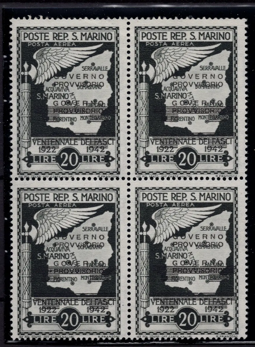 MNH - Vollgummi - Provisorische Regierung Luftpost Lire 20 Nr. A47 wunderschönes Viertel mit doppeltem Aufdruck, das zweite stark nach oben verschoben, neuer perfekter Vollgummi - Nicht katalogisiert Cod. 3140/WEB