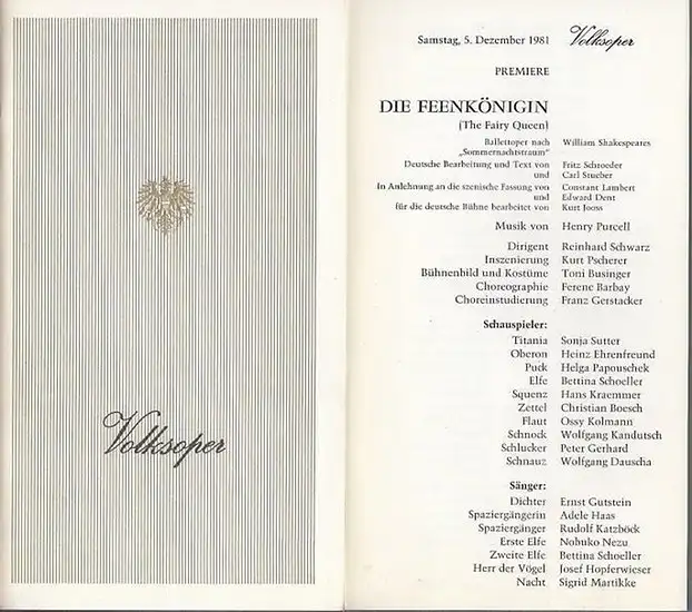 Purcell, Henry . Volks - Oper Wien. - 1981: Volksoper Wien. Saison (Jahr): 1981. Die Feenkönigin (The Fairy Queen).Ballettoper nach d. "Sommernachtstraum" Shakespeares. Deutsche Bearbeitung : Text v. Fritz Schroeder / Carl Stueber. Für d. Deutsche Bühne