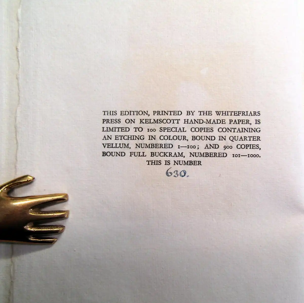 Diese Ausgabe ist auf 900 Exemplare limitiert, dies ist Nr. 630. Ohne Datum, [1932]. Zusätzlich ist dieser Ausgabe noch eine signierte und nummerierte Orig.-Radierung von Bosschere beigebunden diese ist auf 130 Exemplare limetiert, hier die Nr. 13 Farbige Frontis (Orig. Linolschnitt (Linocut)) u. 16 Tafeln (es sollten einundzwanzig sein, aber dem Verleger, dem berüchtigten R. A. Caton, waren offensichtlich einige ausgegangen, aber er machte trotzdem weiter mit diesen Spätausgaben, die normalerweise 16 Tafeln umfassen), zahlreiche Schwarzweiß-Illustrationen, einige ganzseitige und 16-seitige Einführungen des Künstlers. First edition. This edition is limited to 900 copies, this is No. 630. Undated, [1932]. In addition, this edition also includes a signed and numbered original etching by Bosschere, limited to 130 copies, this is No. 13. Colored frontis (original linocut) and 16 plates (there were supposed to be twenty-one, but the publisher, the notorious R. A. Caton, had obviously run out of some, but he continued with these late editions, which normally contain 16 plates), numerous black and white illustrations, some full-page and 16-page introductions by the artist. Dust jacket with small tears, book cover slightly discolored. Overall a fine copy.