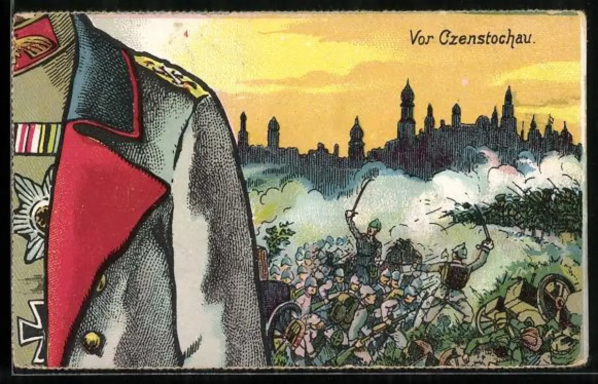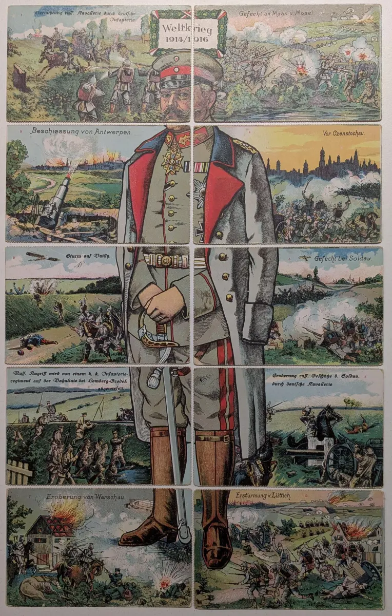 Puzzle-AK 10 Karten, Paul von Hindenburg mit Schlachtszenen aus Warschau, Czenstochau, Soldau, Antwerpen und Lüttich