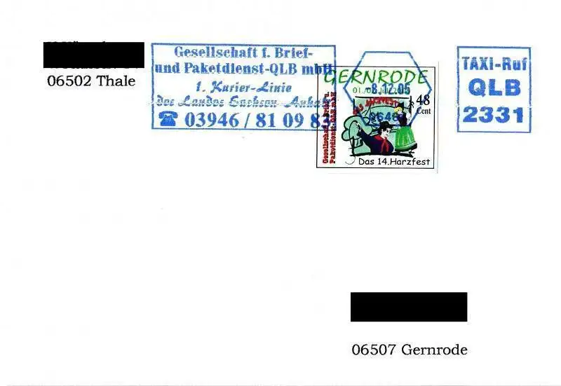 • MichSeite Brief- und Paketdienst QLB: 00.12.2005, "14. Harzfest, Gernrode", Satz, Ganzstück, Tagesstempel Beschreibung \nAusgabeland: Bundesrepublik Deutschland \nPostdienstleister: Gesell. Für Brief- und Paketdienst-QLB mbH, Quedlinburg \nAusgabeanlass: Briefmarkenausgabe "14. Harzfest, Gernrode" Katalognummer: - Ausgabedatum: 0.12.2005 Nominale: Satz (1 Wert) zu 0,48 EUR \nTyp: - \nErhaltung: selbstklebend, gerade gestanzt, Ganzstück mit Tagesstempel \nHinweis: - Thema: Sachsen-Anhalt, Mittelgebirge
