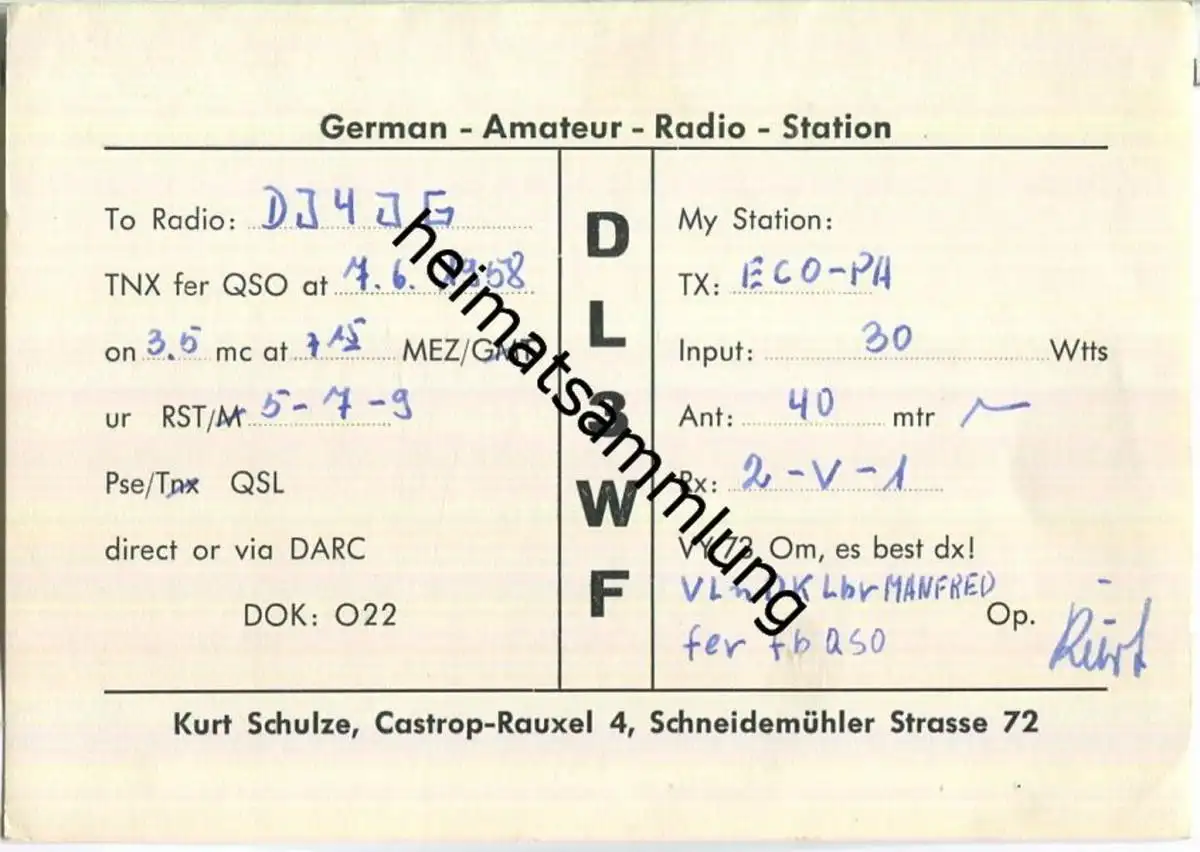 QSL - QTH - Funkkarte - DL3WF - Castrop-Rauxel - 1958 (G56685) *