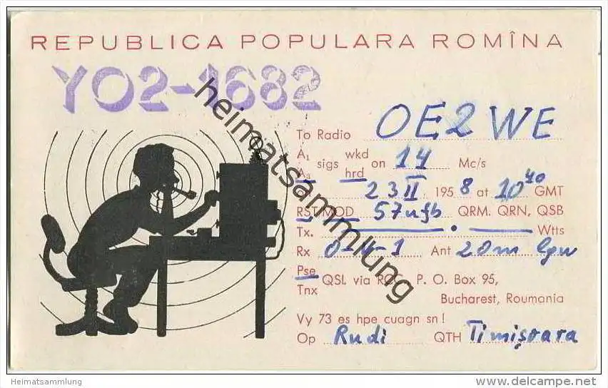 QSL - QTH - Funkkarte - YO2-1682 - Rumänien - Timisoara - 1958