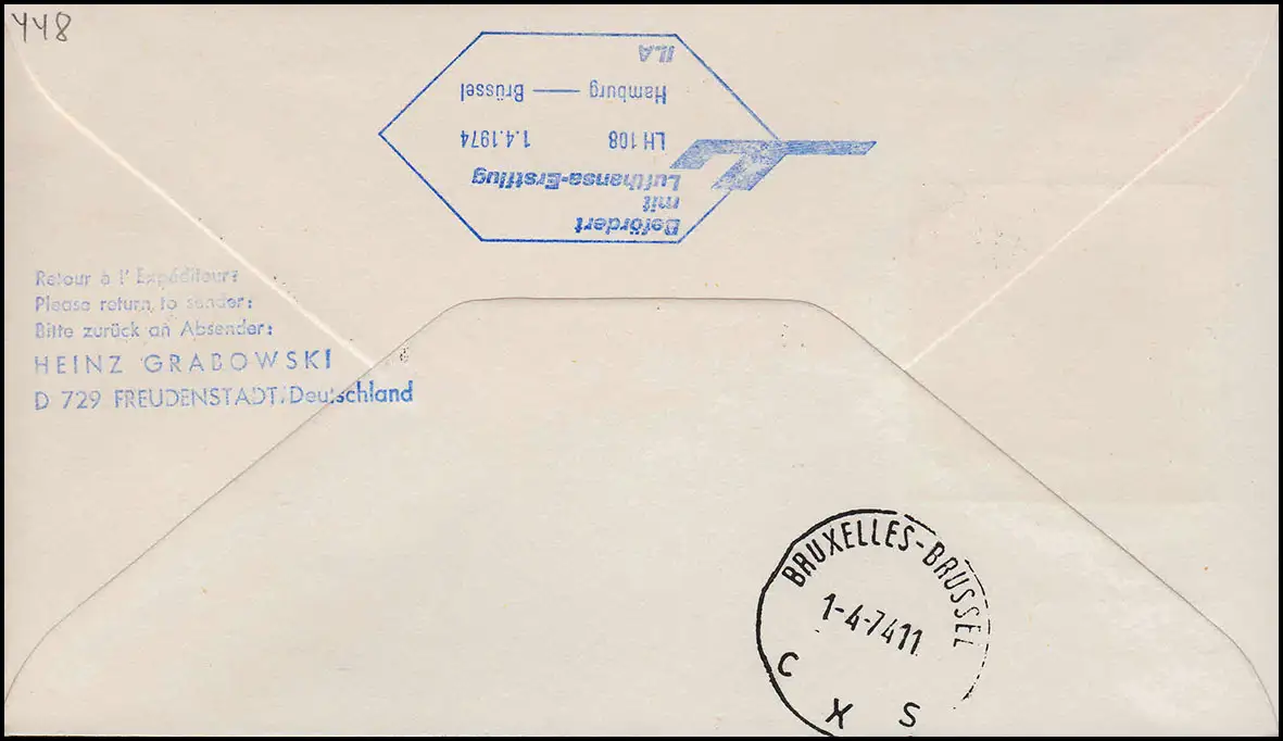 Vorder- und Rückseite blauer " Befördert mit..." Stempel, Rückseite Ankunftstempel Bruxelles /Brüssel 1-4-74 CXS. Lila Retour Stempel Vorderseite.