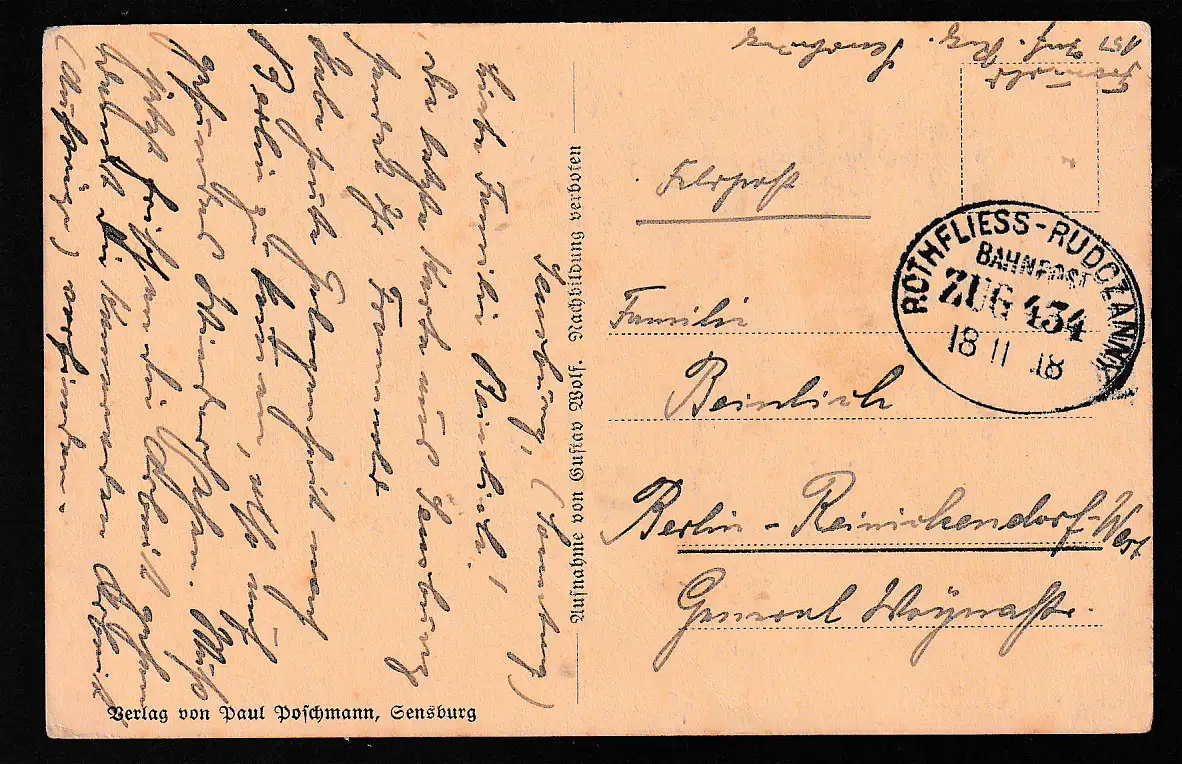 ROTHFLIESS-RUDCZANNY BAHNPOST ZUG 434 18.11.18 auf Feldpost-AK (Sensburg Wochenmarkt)