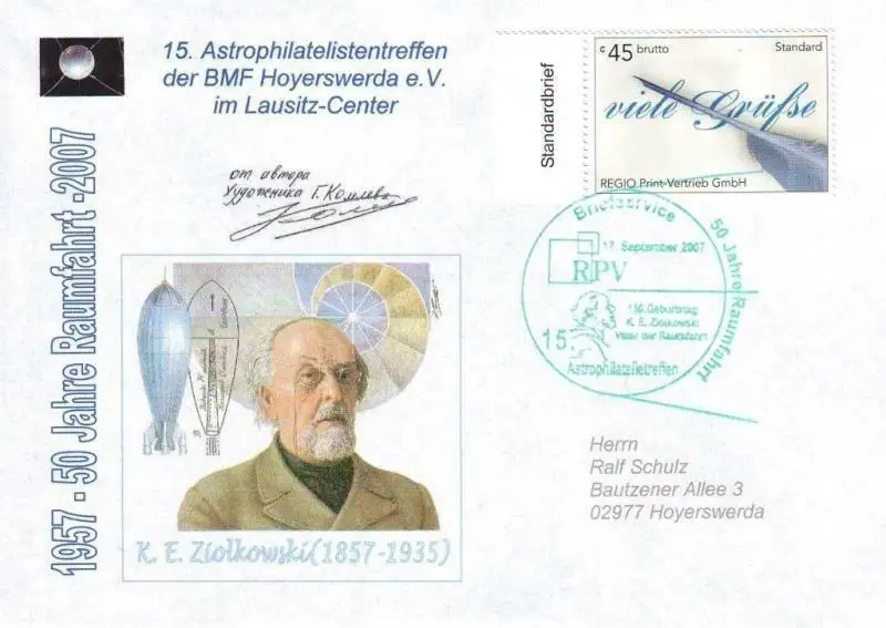 • MichSeite RPV: MiNr. 2, 01.09.2004, "15. Astrophilatelistentreffen der BMF Hoyerswerda e. V.", Sonderbeleg (Umschlag), Sonderstempel (grün) Beschreibung \nAusgabeland: Bundesrepublik Deutschland \nPostdienstleister: Regio Print-Vertrieb, Cottbus \nAusgabeanlass: Briefmarkenausgabe "Kommunikationsmittel" Katalognummer: MiNr. 2 Ausgabedatum: 01.09.2004 Nominale: Wert zu 0,45 EUR \nTyp: - \nErhaltung: nassklebend, gezähnt, Sonderbeleg, Sonderstempel "150. Geburtstag K. E. Ziolkowski / Vater der Raumfahrt" (lila) \nHinweis: Sonderbeleg (Postkarte) "15. Astrophilatelistentreffen der BMF Hoyerswerda e. V. im Lausitz-Center"