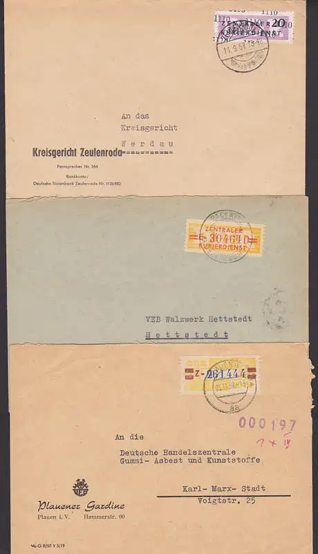 Rackwitz (Kr. Delitzsch), Plauener Gardine, Kreisgericht Zeulenrode, drei ZKD-Bfe, Keisaufdruck 1110