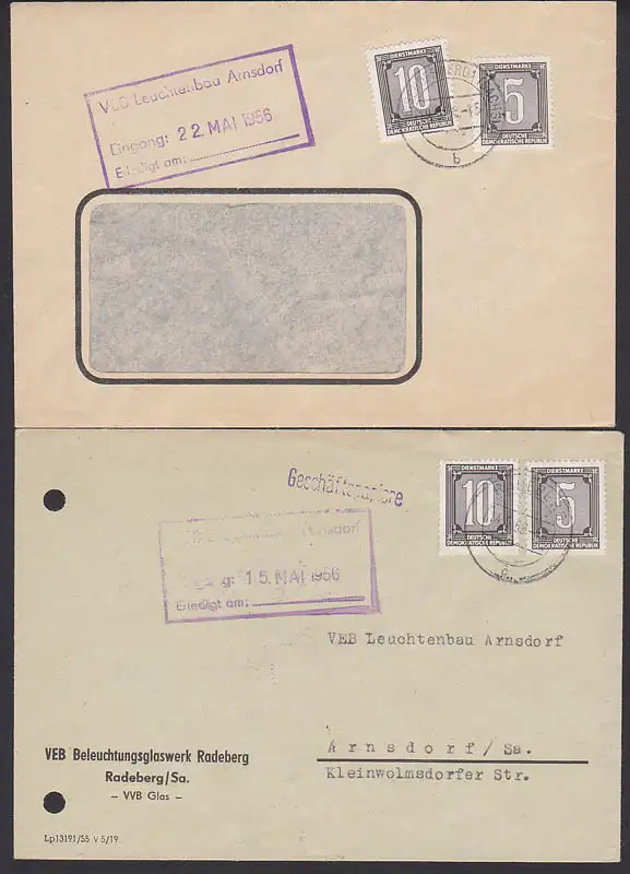 Radeberg (Sachs) zwei Briefe als offene Sendung - nicht erlaubt - mit 5 und 10 Pf. (B1, B2)