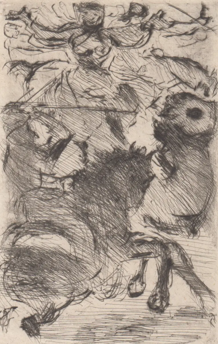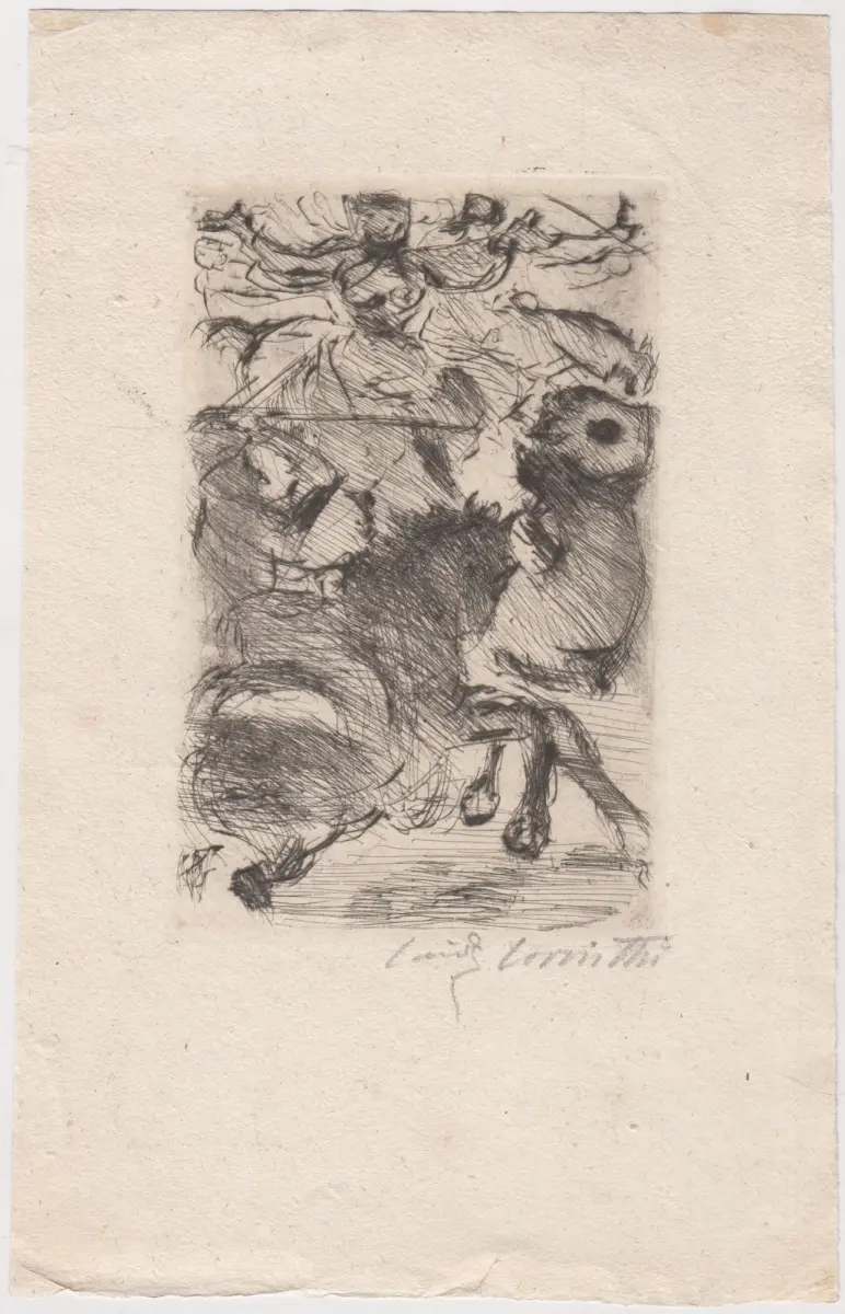 Bemerkungen: Zustand: Gut. Das Blatt ist altersbedingt minimal gebräunt und minimal fleckig. in der linken oberen Ecke befindet sich eine winzige Knickspur außerdem weist das Papier einen kleinen Riss am unteren Rand auf // Es handelt sich um eine Radierung von Lovis Corinth. Die Grafik, mit dem Titel Adhba das Kamel (Adhba the Camel) ist um 1919 entstanden. Der Druck selbst ist in einem sehr guten Zustand und die Linien sehr klar. Er hat ein Motivmaß von 13,5 x 8,6 cm und ist rechtseits unterhalb vom Künstler signiert. Lovis Corinth (18581925) war ein bedeutender deutscher Maler, Zeichner und Grafiker des späten 19. und frühen 20. Jahrhunderts. Er gilt als eine Schlüsselfigur des Übergangs vom Realismus und Impressionismus zum Expressionismus in der deutschen Kunst.