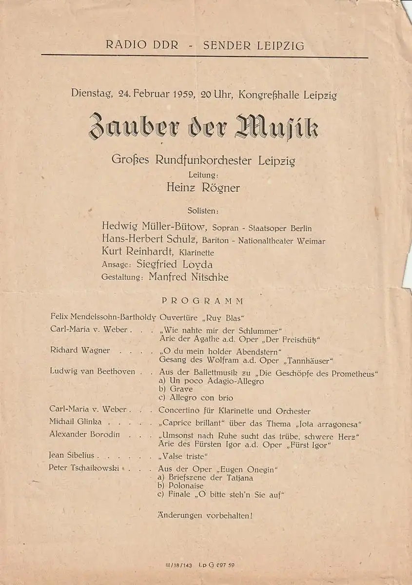 Großes Rundfunkorchester Leipzig. Leitung: Heinz Rögner. Mitwirkende: Hedwig Müller-Bülow, Sopran / Hans-Herbert Schulz, Bariton / Kurt Reinhardt, Klarinette. Ansage: Siegfried Loyda. Gestaltung: Manfred Nitschke. Programm: Werke von Mendelssohn-Batholdy, Carl-Maria von Weber, Richard Wagner, Ludwig van Beethoven, Michail Glinka, Alexander Borodin, Jean Sibelius und Peter Tschaikowski - Theaterprogramm, Opernprogramm, Ballettprogramm, Musicalprogramm, Konzertprogramm, Theatermemorabilia, Programmhefte Sammlung, deutsche Theatergeschichte.