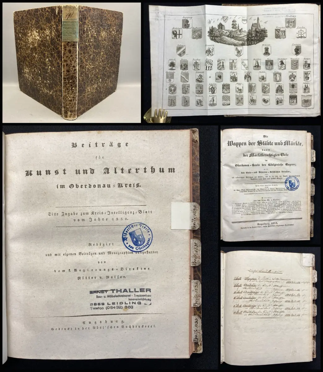 mit 1 gefalt. Frontispiz(Wappentafel), Das Frontispiz zeigt 55 Wappen der dazu berechtigten Orte und eine Abbildung der Burg Wittelsbach,2 Bl., 110 S., 1 Bl., Beiträge für Kunst und Alterthum im Oberdonau- Kreis. Jahrgänge 1829-33 1Bl., 48 S., 1 Bl., 62 S., 2 Bl., 40 S., 2 Bl., 44 S., 2 Bl., 44 S., Ppbd. d. Zt. mit goldgeprägtem RS