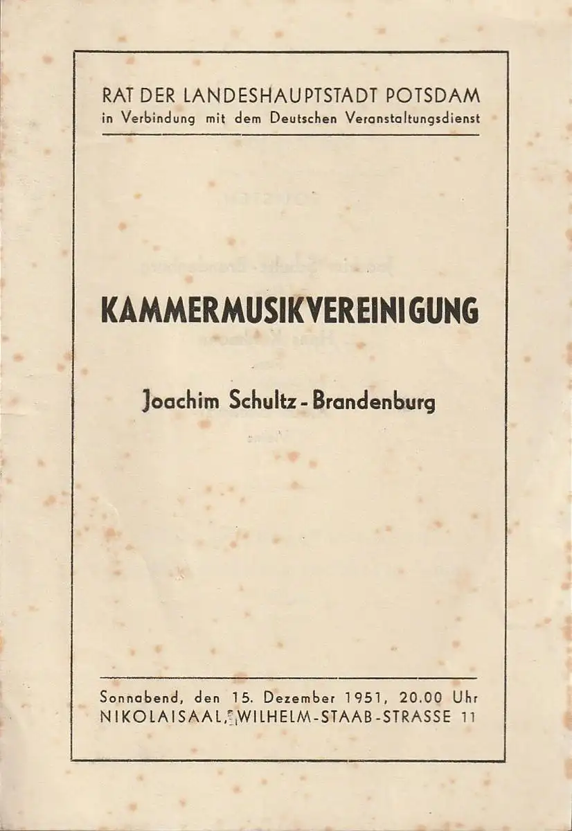 Rat der Landeshauptstadt Potsdam in Verbindung mit dem Deutschen Veranstaltungdienst: Programmheft KAMMERMUSIKVEREINIGUNG JOACHIM SCHULTZ-BRANDENBURG 15. Dezember 1951 Nikolaisaal.
