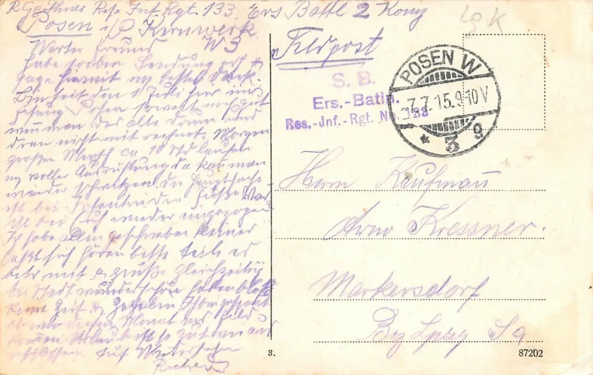 Rückseite: gelaufen 1915 von Posen W.