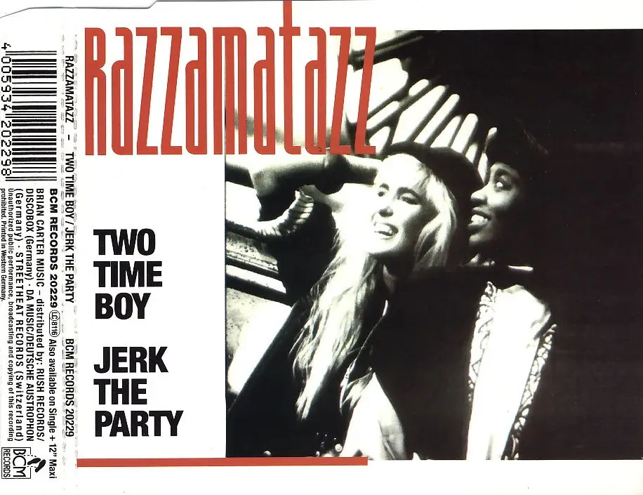 CD Single Razzamatazz - Two Time Boy / Jerk The Party, Jens Lissat, Ramon Zenker, Zustand CD M- Hülle M-; Made in Germany BCM Records 20229, Tracks Two Time Boy [Radio Time] 4:31, Two Time Boy [Caracho Mix] 6:55, Jerk The Party [Radio Culture] 3:30