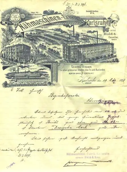 Artikelbeschreibung u. Zustand : Siehe Scan / rechter Rand Fehlstelle restauriert. Weitere Infos : Huebsches, altes Rechnungsformular der Firma Naehmaschinen-Fabrik Haid Neu, KARLSRUHE 1898. Eventuell auch fuer den AK- u. Heimatsammler interessant ? PLZ-Bereich pauschal 76131