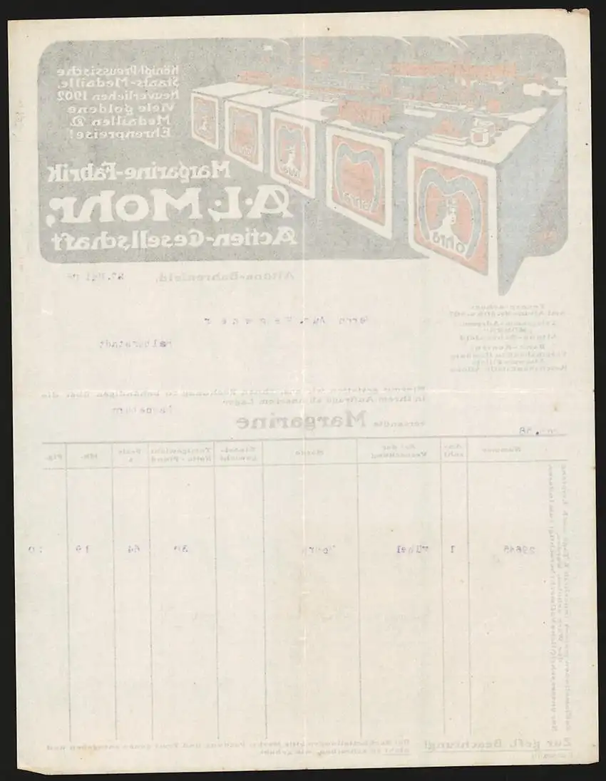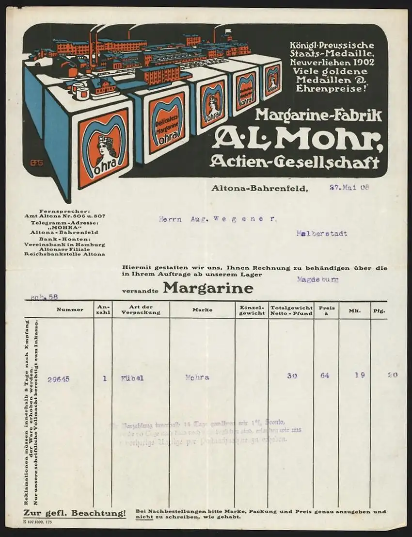 Rechnung Altona-Bahrenfeld 1908, A. L. Mohr AG, Margarine-Fabrik, Modellansicht auf Packungen von Mohra