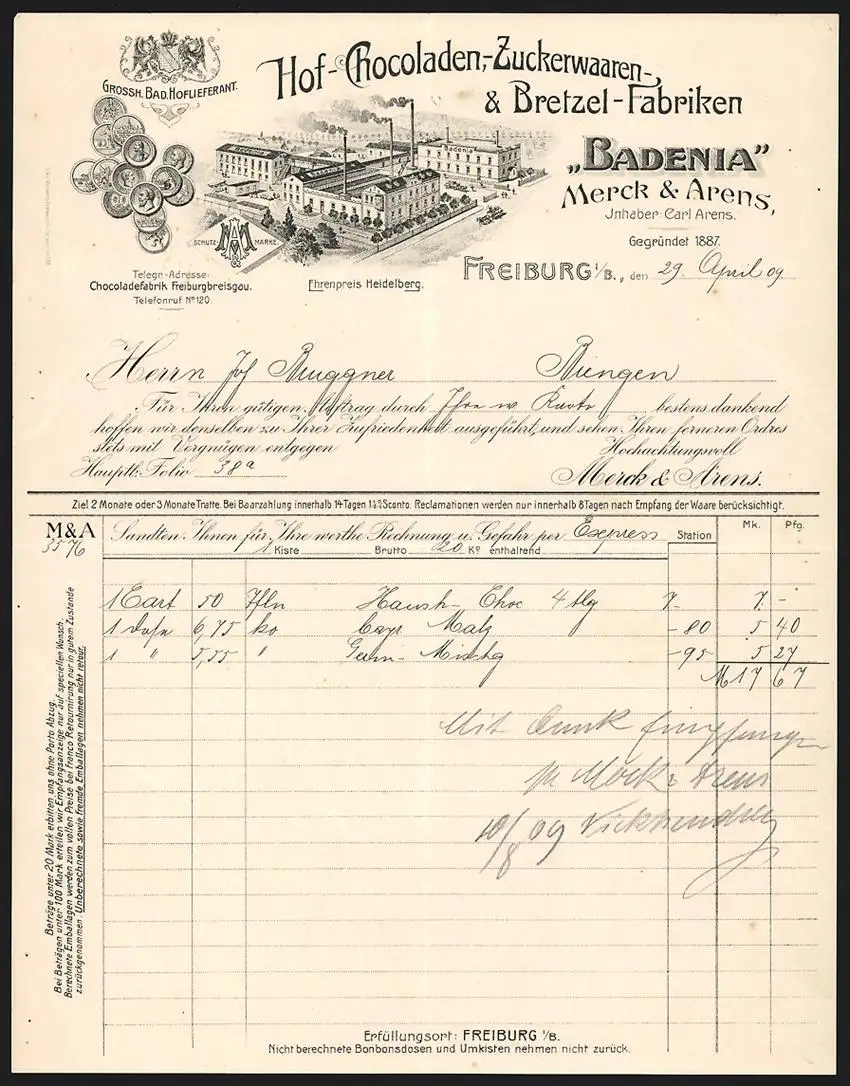 Rechnung Freiburg i. B. 1909, Badenia, Hof-Chocoladen-, Zuckerwaaren- und Brezel-Fabriken Merck & Arens, Werkansicht
