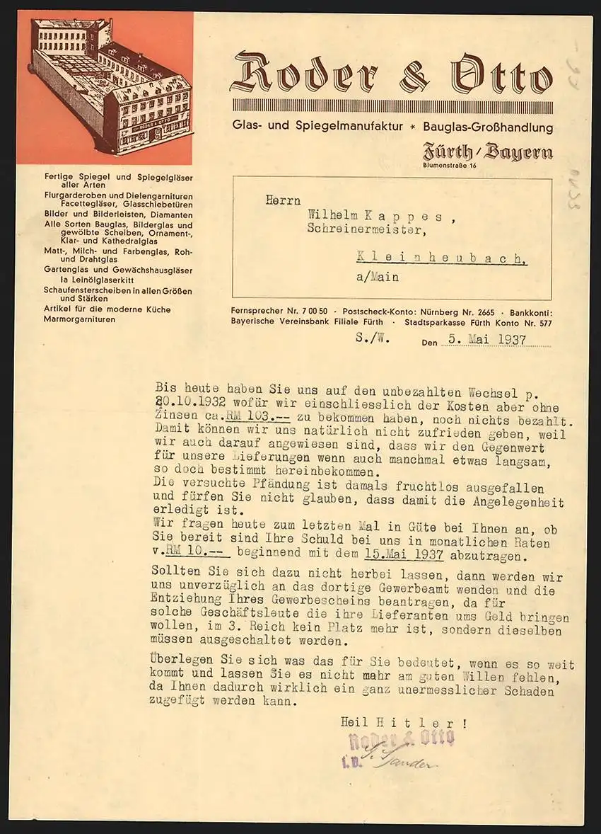 Rechnung Fürth 1937, Roder & Otto, Glas- & Spiegelmanufaktur, Model des Betriebsgeländes