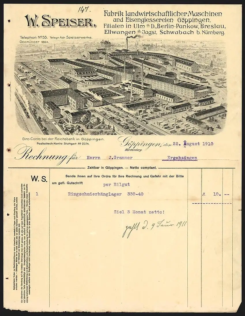 Rechnung Göppingen 1910, W. Speiser, Fabrik landwirtschaftl. Maschinen, Gesamtansicht der Fabrikanlage mit Lagerplätzen