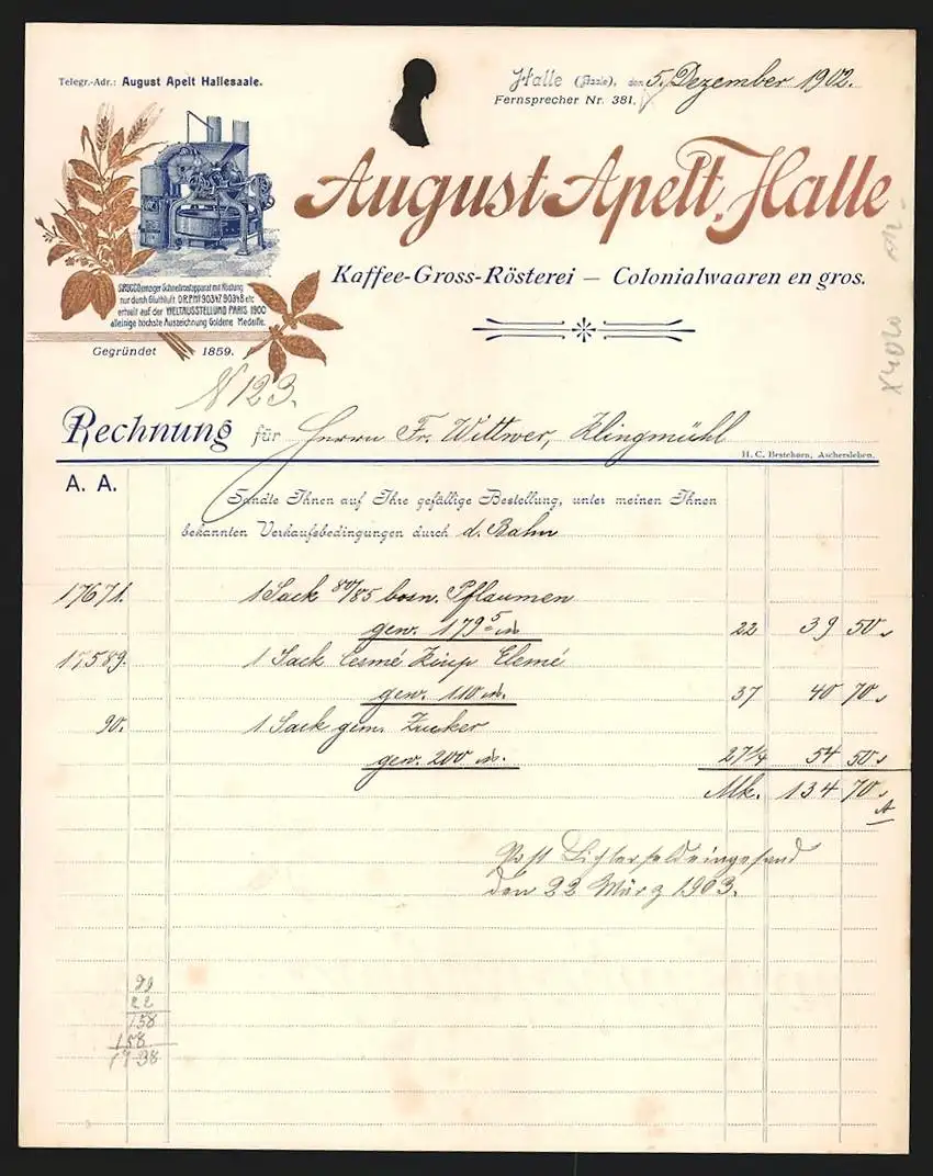 Rechnung Halle 1902. August Apelt, Kaffe-Rösterei und Kolonialwaren, Ansicht eines Sirocco-Schnellröstapparats