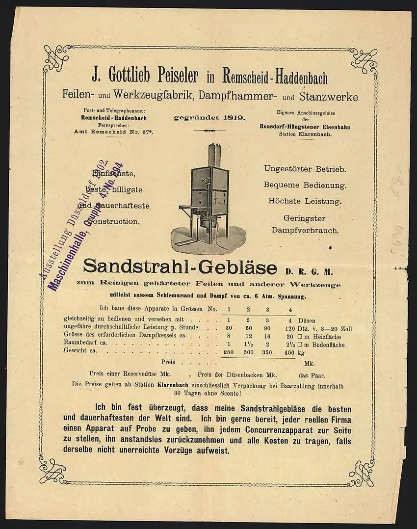 Rechnung Remscheid-Haddenbach, J. Gottlieb, Feilen- & Werkzeugfabrik und Stanzwerke, Ansicht einer Stanzmaschine