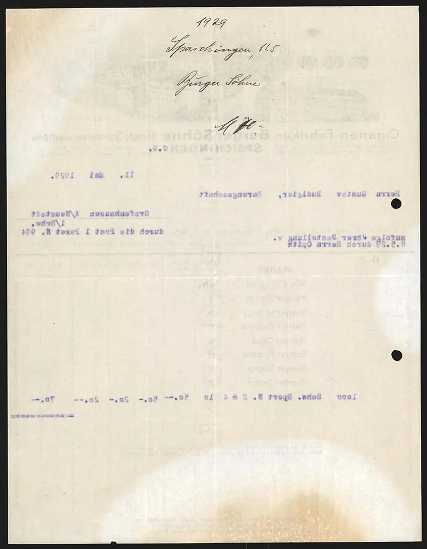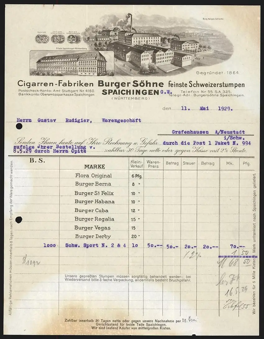 Rechnung Spaichingen (Württemberg) 1929, Burger Söhne Cigarren-Fabriken, Werk Aargau, Filiale Spaichingen, Medaillen