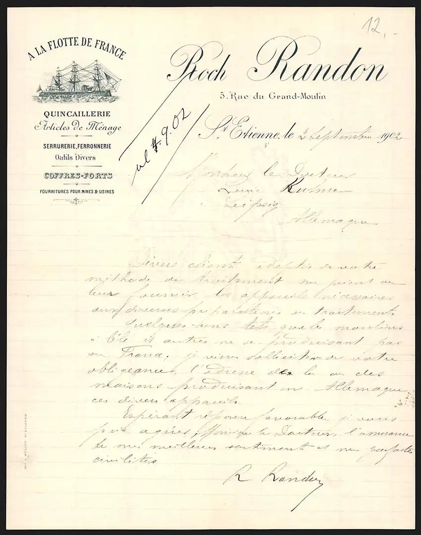 Rechnung St. Etienne 1902, Roch Randon, Quincaillerie, Articles de Ménage, 5 Rue du Grand-Molin, Ein Dreimaster