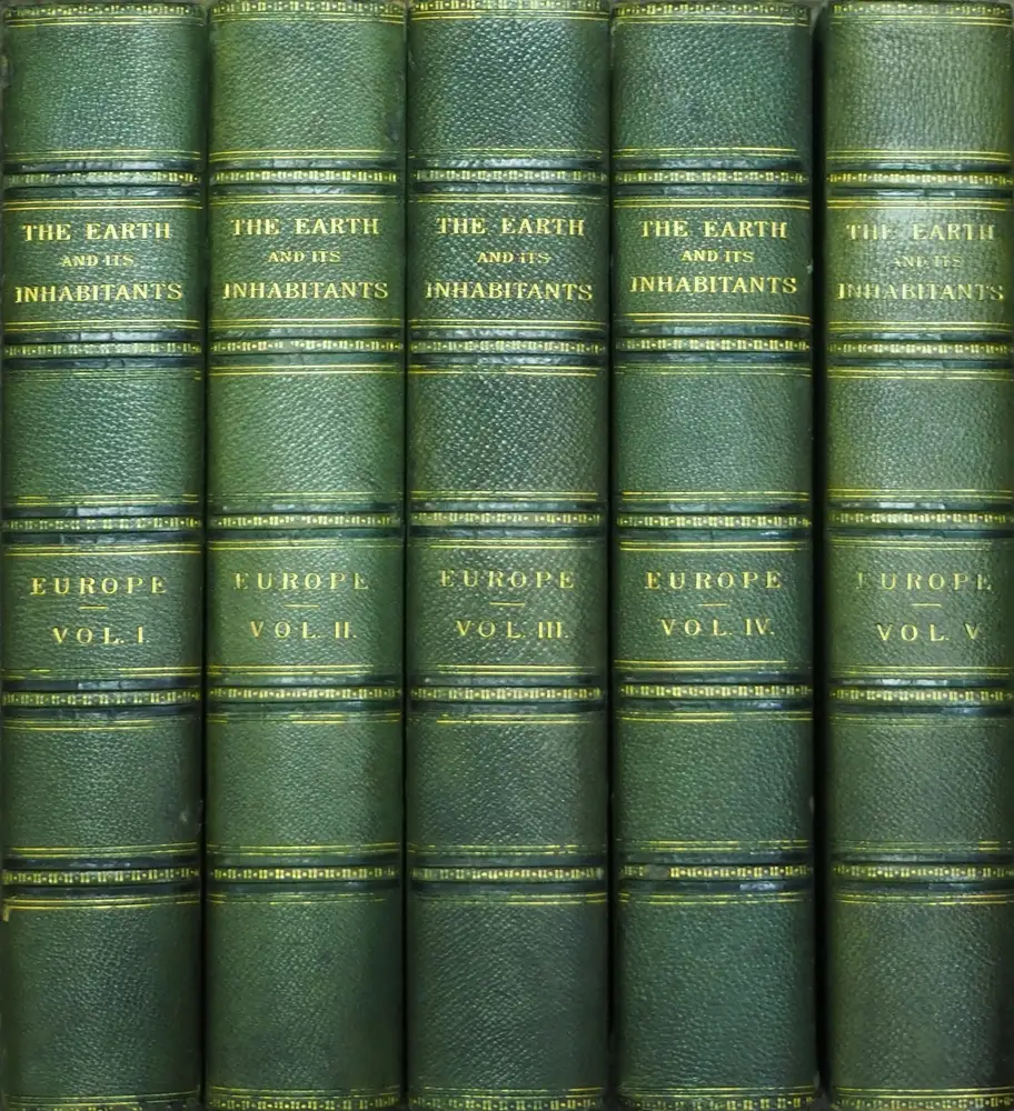 [Nouvelle géographie universell]. - [1.] Greece, Turkey, Rumania, Servia, Montenegro, Italy, Spain, and Portugal / [2.] France and Switzerland / [3.] Austria-Hungary, Germany, Belgium, and the Netherlands / [4.] -- The British Isles / [5.] The North-East Atlantic, Islands of the North Atlantic, Scandinavia, European Islands of the Arctic Ocean, Russian in Europe. - Leder mit Schabstellen (vor allem Deckelecken); sämtliche marmor. fliegende Vorsatzblätter herausgeschnitten. Bindung und Buchblöcke stramm und sehr gut erhalten