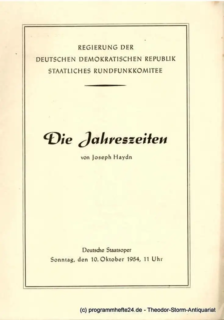 Regierung der Deutschen Demokratischen Republik. Staatliches Rundfunkkomitee: Programmheft Die Jahreszeiten von Joseph Haydn. Deutsche Staatsoper Sonntag, den 10. Oktober 1954, 11 Uhr.