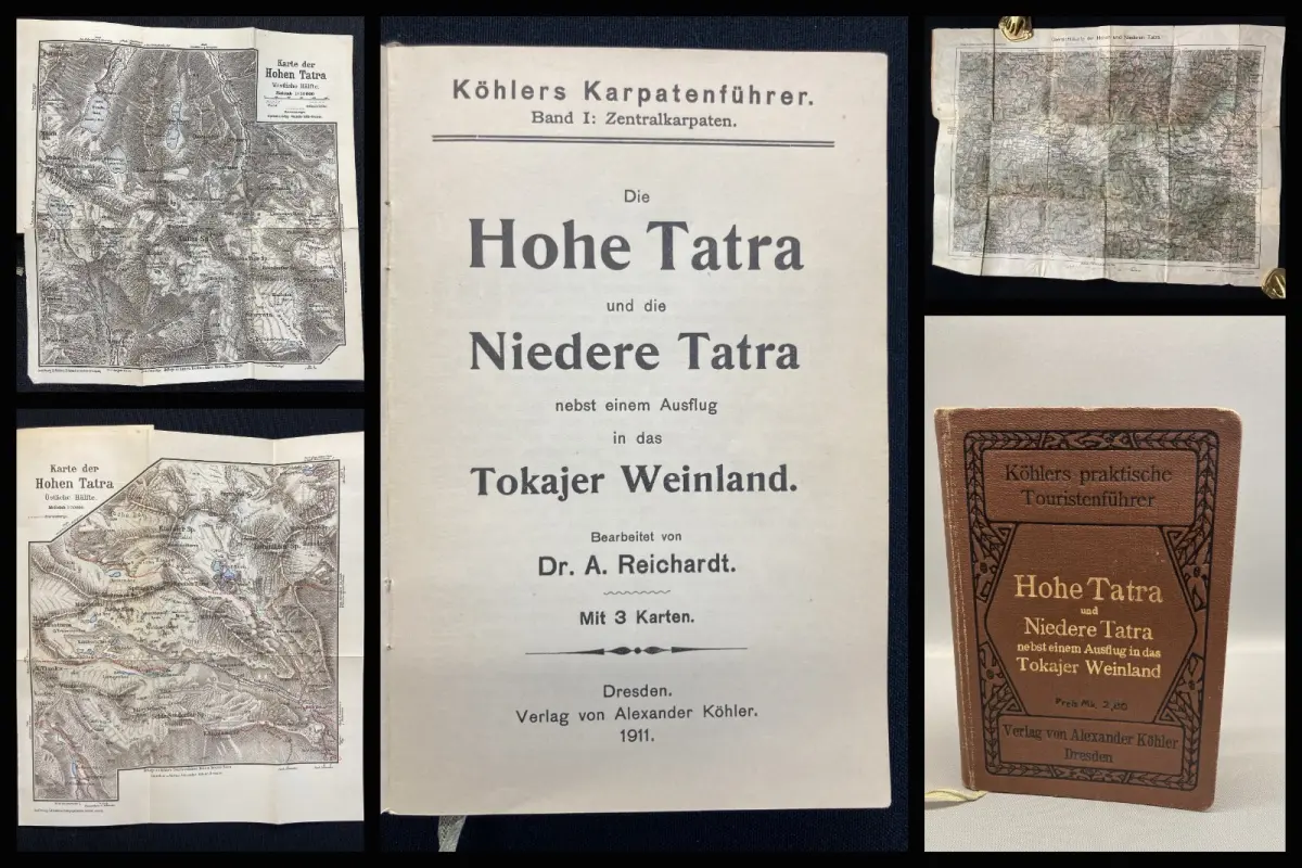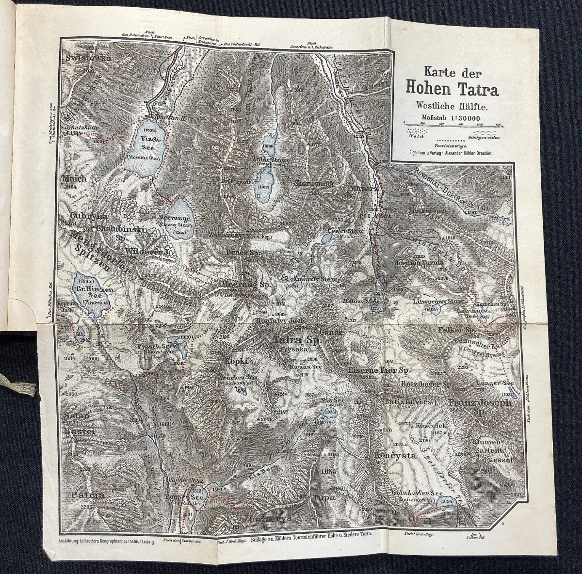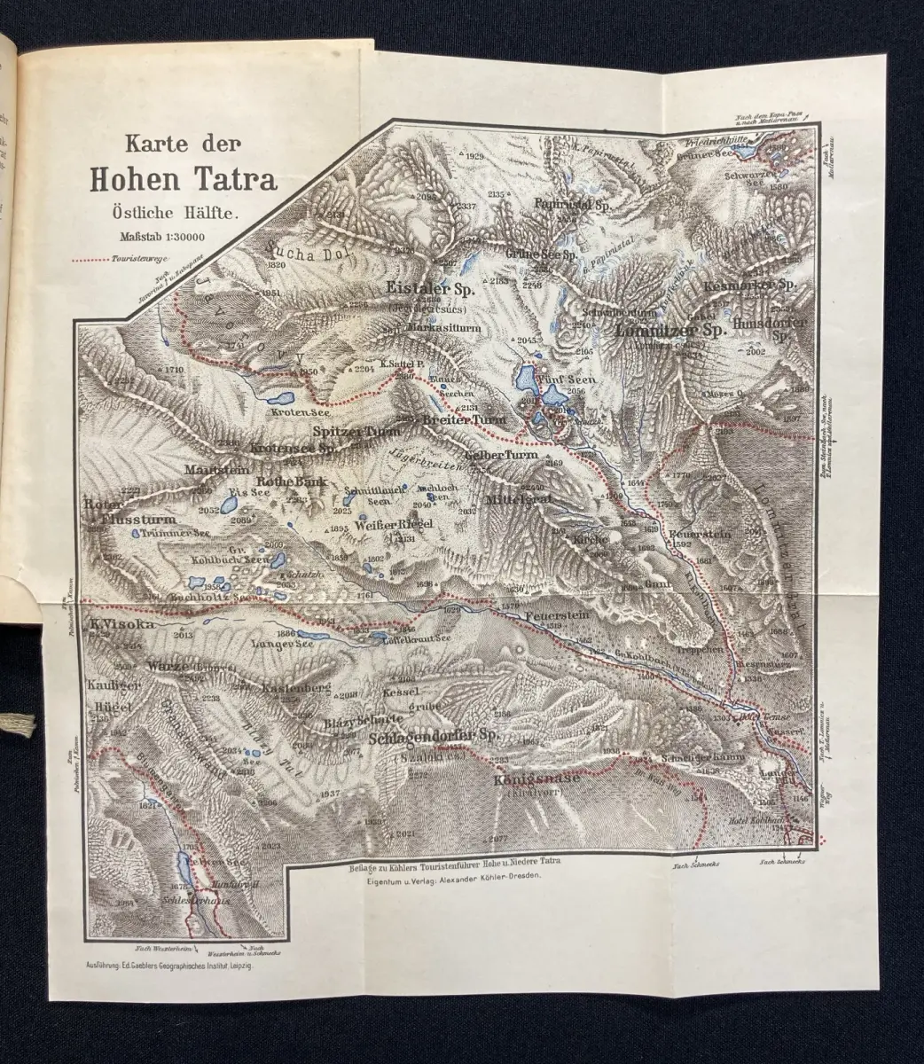 mit 3 Karten(Östlicher Teil, Westlicher Teil und die Niedere Tatra), 228 S., Inseratenanhang Seite 1-16(Seite 3-12 fehlt), Karte der Niederen Tatra mit hinterlegten Einrissen liegt bei, gold-/schwarzgeprägter Leineneinband