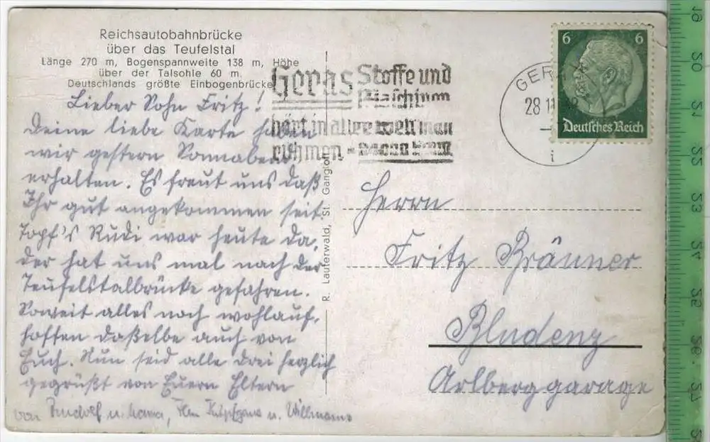 Reichsautobahnbrücke über das Teufelstal - 1938-, Verlag: R. Lauferwald, St. Gangloff, POSTKARTE mit Frankatur,