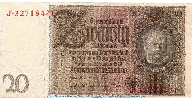Reichsbanknote über Zwanzig Mark von 1929 , Weimarer Republik - deutsche ReichsbankGrabowski / Rosenberg / Pick : DEU-184.b / 174 / 181