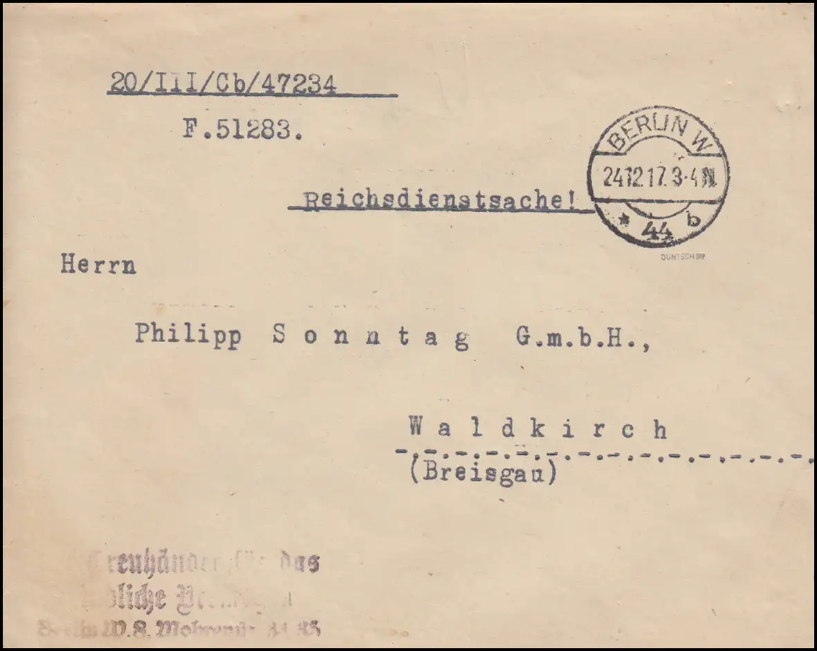 Briefstempel Der Treuhänder für das feindliche Vermögen an die Sonntag GmbH in Waldkirch / Breisgau, BPP- und INFLA-geprüft Einwandfrei, rückseitig gedrucktes Dienstsiegel Reichsamt des Innern.