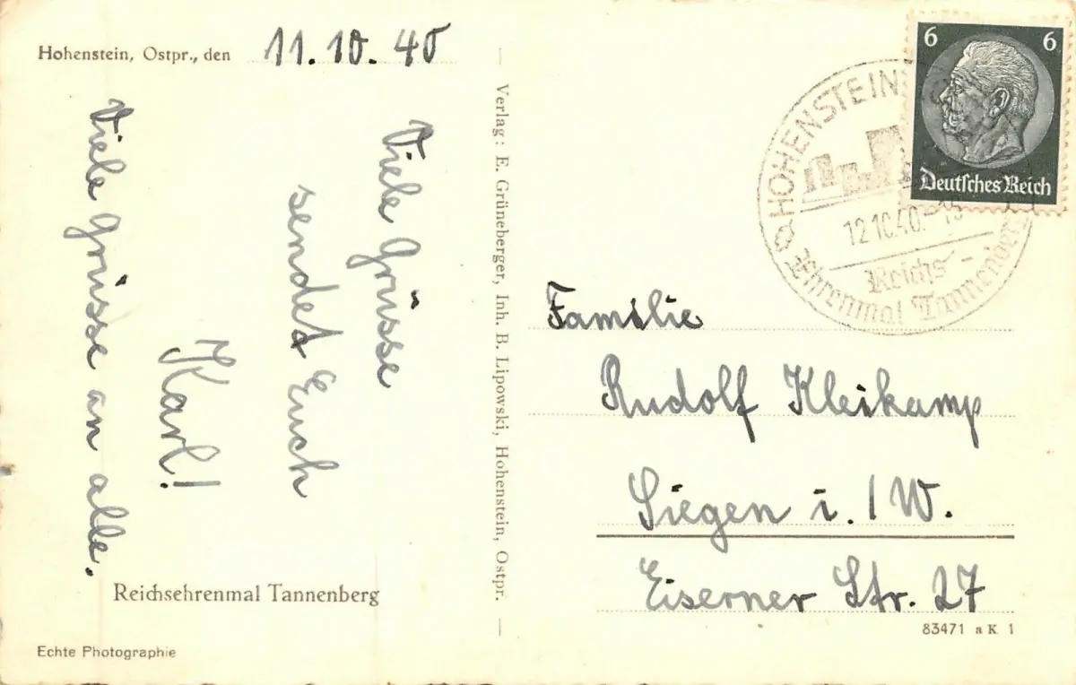 Rückseite: gelaufen 1940 von Hohenstein (Ostpr.)