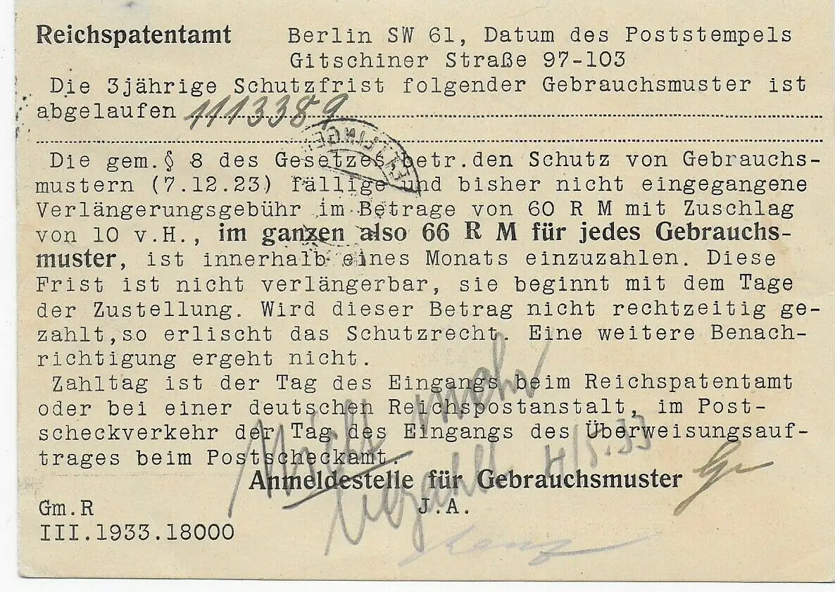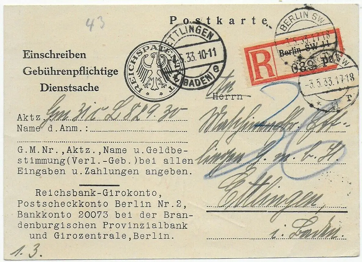 Reichspatentamt Berlin, Einschreiben Berlin-pa nach Ettlingen, 1933
