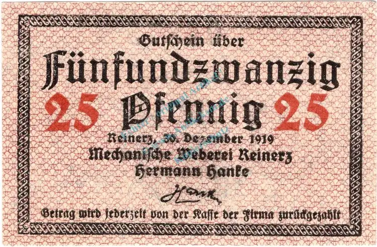 Reinerz , Notgeld 25 Pfennig Schein unc-kfr. Ti.6005.05.11 , Schlesien 1919 Verkehrsausgabe