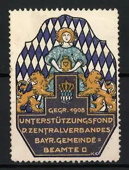 Reklamemarke Bayern, Unterstützungsfond d. Zentralverbandes Bayr. Gemeinde-Beamte, Löwen und Wappen, 1908
