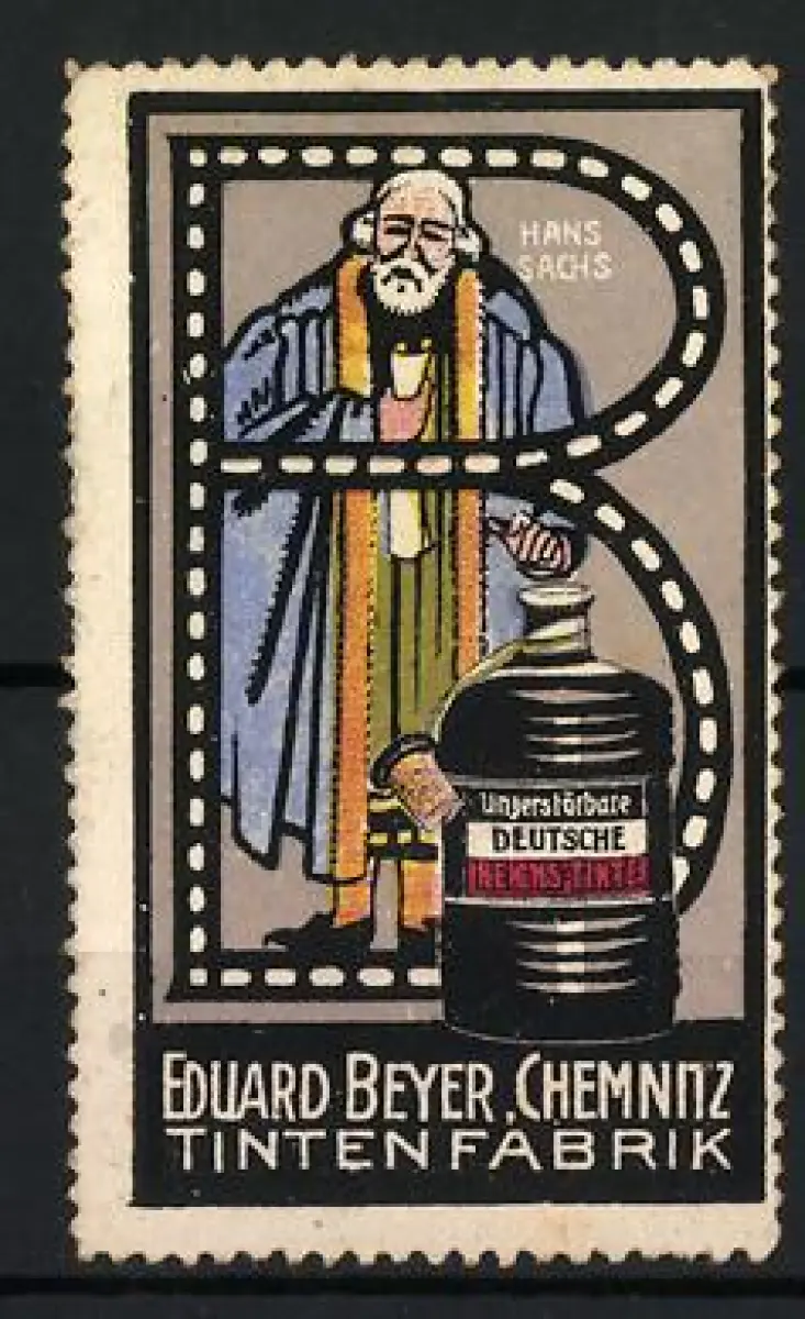 Reklamemarke Chemnitz, Eduard Beyer Tintenfabrik, Hans Sachs und Tintenflasche