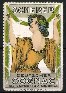 Reklamemarke Langen, Scherer Deutscher Cognac, Frau mit Traubenkranz